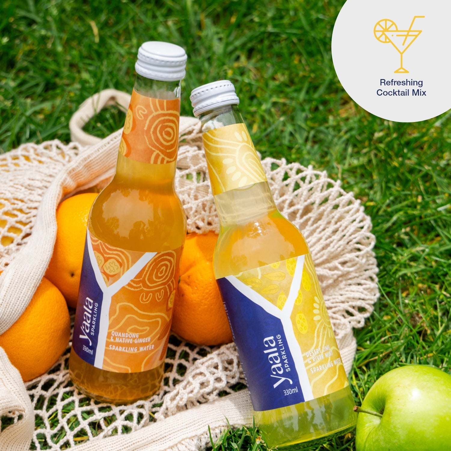 The design includes dots symbolising the diverse native plants that seed, spread, and flourish across Country. Flowing journey lines represent the natural patterns of the land and the meeting places, signifying the act of collecting, sharing, and embracing the vibrant flavors of desert lime and river mint. The yellow fruit in the design represents desert lime, while the leaves symbolise river mint, coming together to celebrate these botanicals shared with people all across Australia.