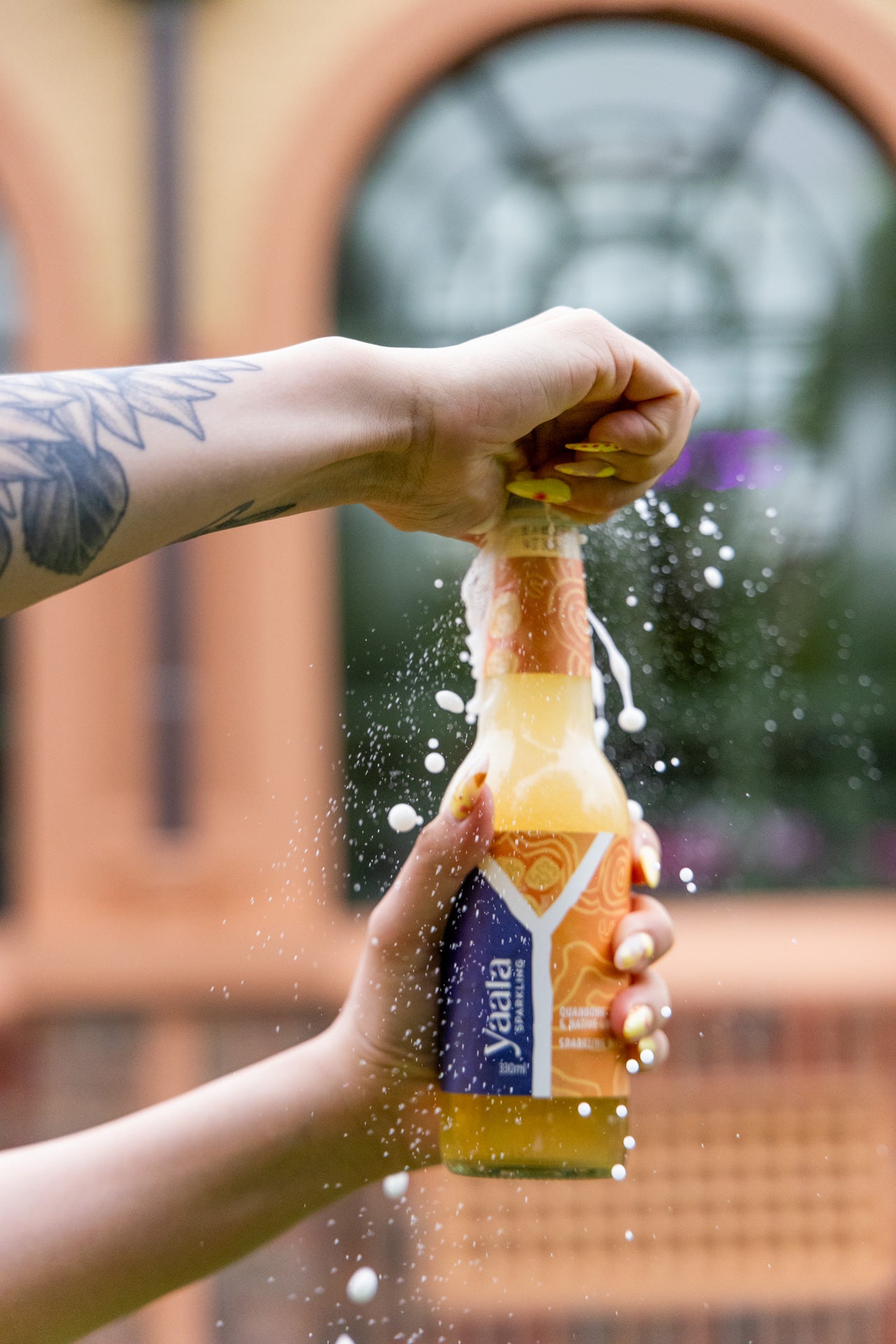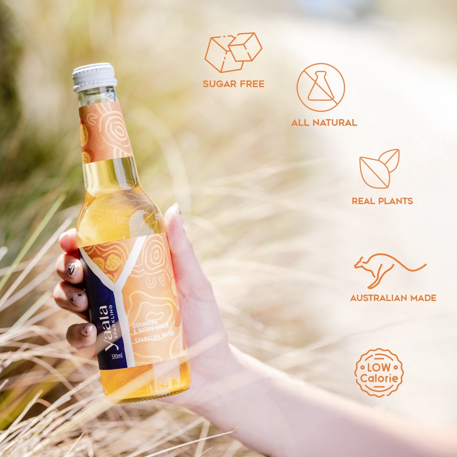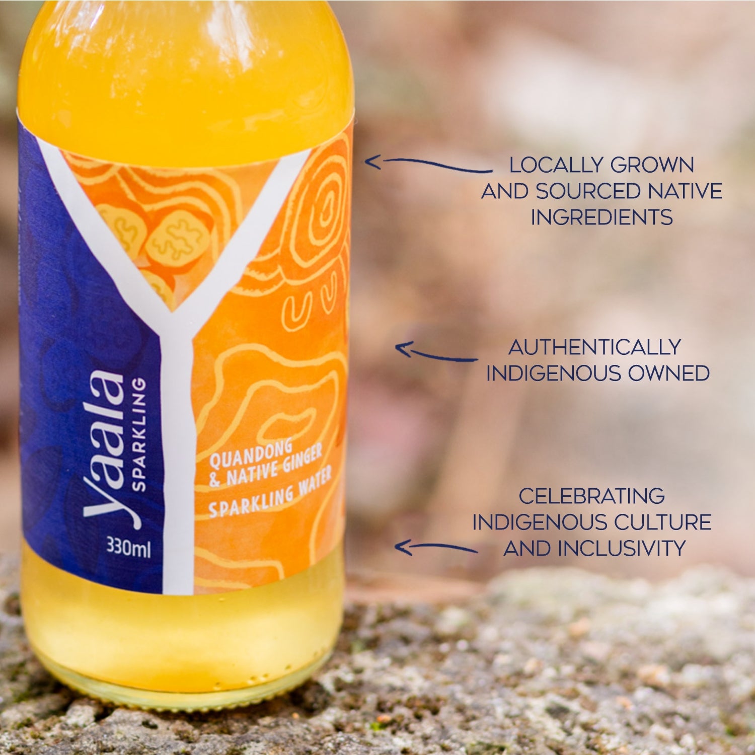 The artwork featured on our Quandong & Native Ginger sparkling water celebrates the connection to Country and the spirit of community. It portrays people coming together to gather native botanicals in a caring and respectful way, honouring their bond with Mother Earth.