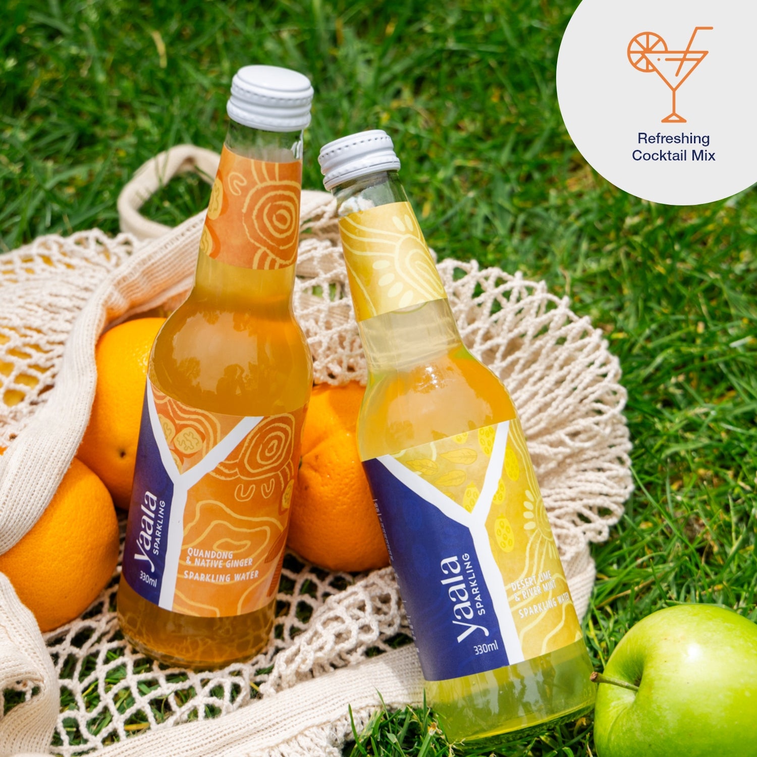 The connected community circles symbolise unity, while the journey lines represent the movement and gathering across the diverse landscapes where these native plants thrive. These patterns reflect the beautiful regions that nurture these botanicals. The seeds depict the vibrant quandongs, and the bright leaves represent the refreshing ginger mint, bringing the essence of these ingredients to life.